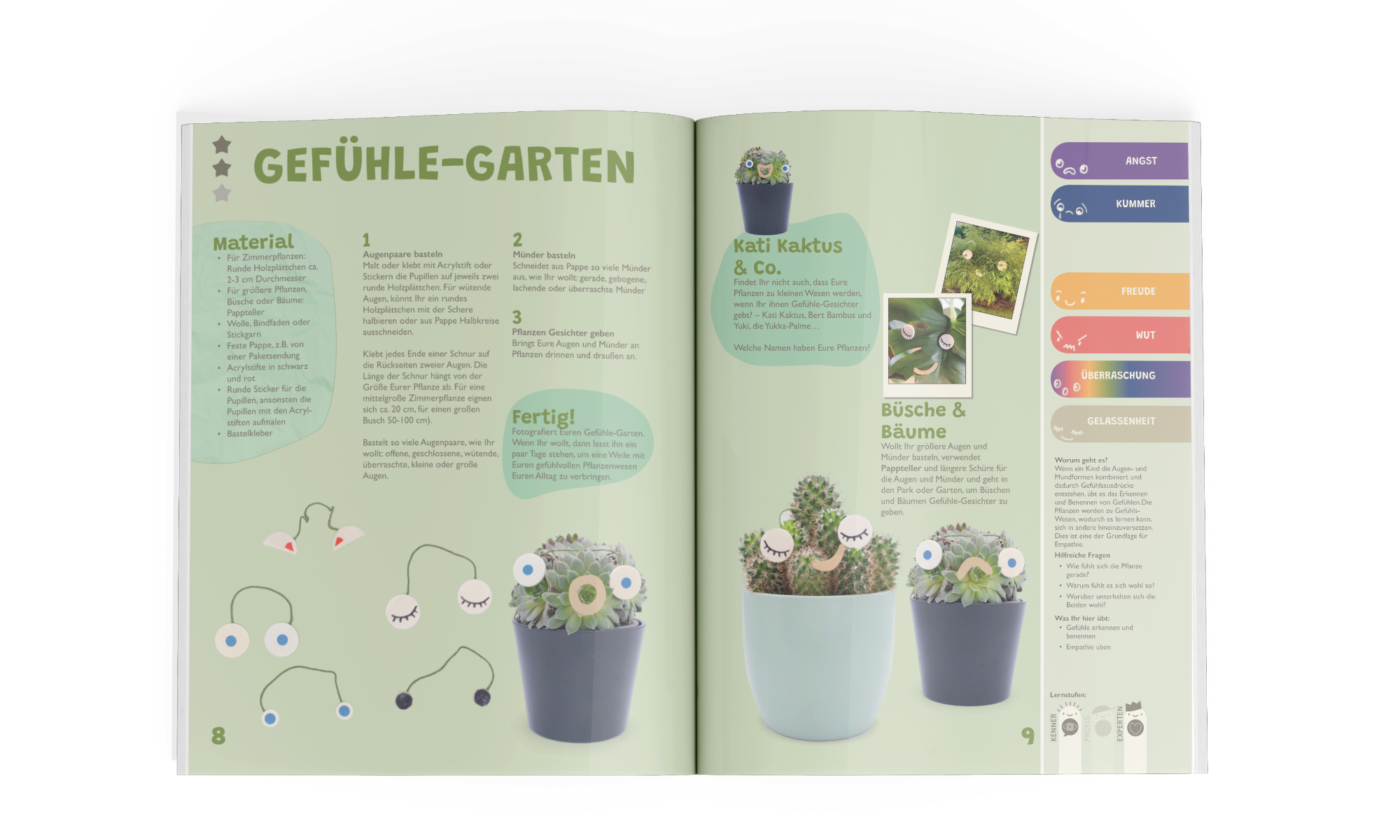 Jedes Gefühl wird zur Bastelei – bei „Wo wohnen meine Gefühle“ malt Dein Kind, wo im Körper es Wut oder Freude spürt. Mit Gefühle-Roboter-Armbändern übt es, zwischen Emotionen zu wechseln. Der Freu-Zauberstab hilft, Abstand zu schwierigen Gefühlen zu gewinnen.